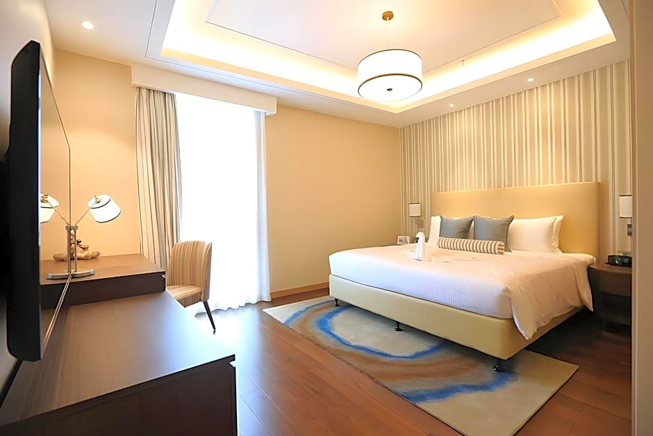 1-Bedroom Deluxe is 646 square feet and includes a king-size bed 150-183 width plus living room.